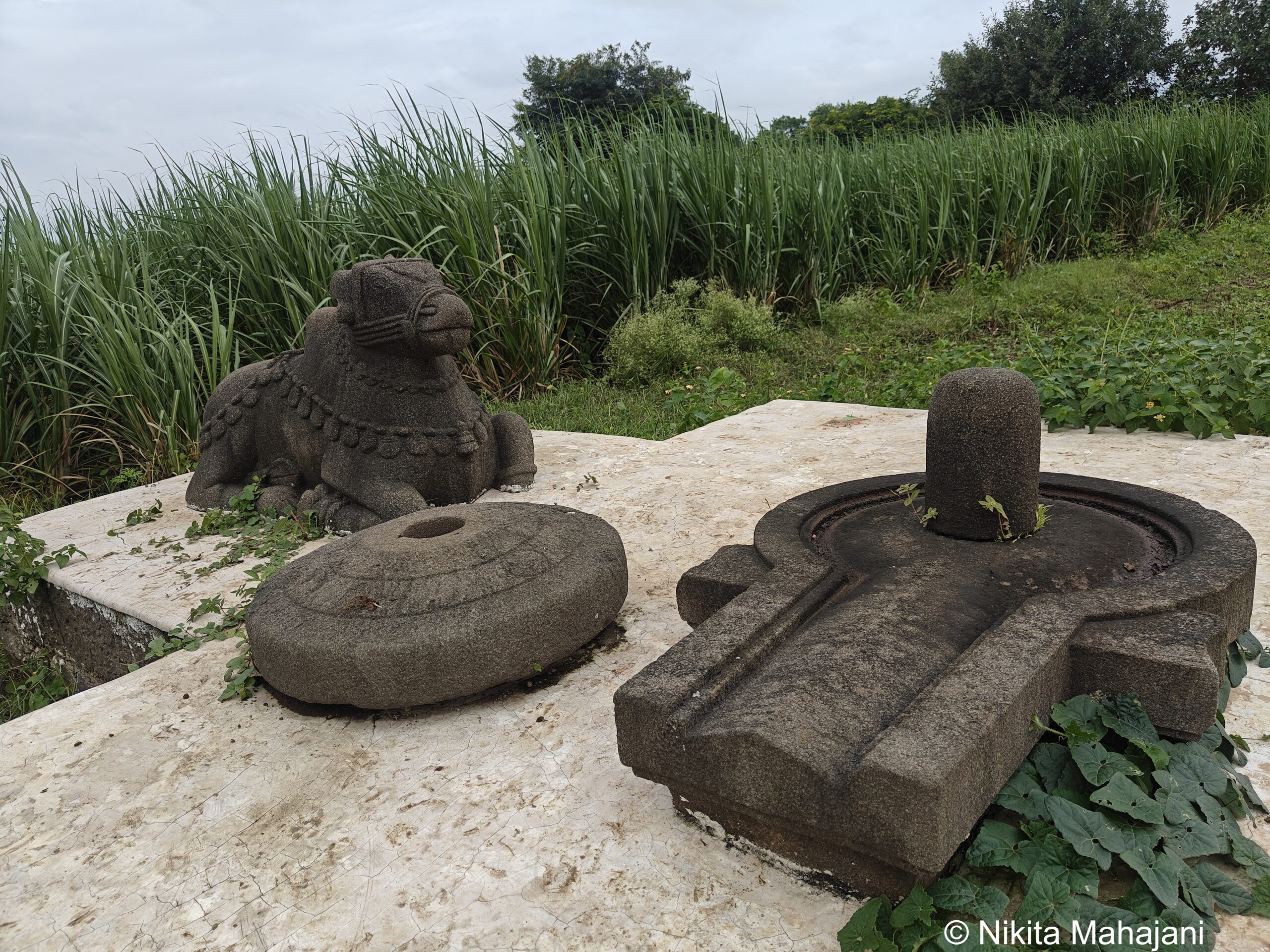 Some archaelogical remnants were found next to the samadhi. They have been installed on a platform in the field. They include a nandi , shivlinga and a wheel.